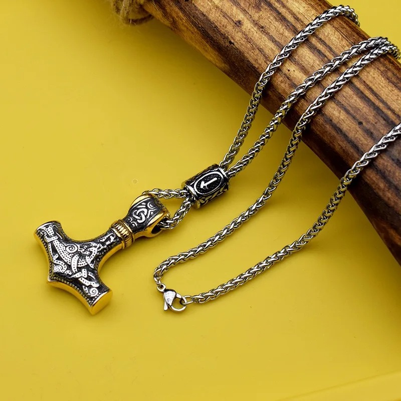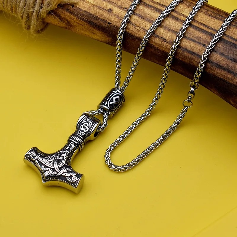 Viking Thor Hammer Stainless Steel Pendant Necklace with Chain and 2 Runes Beads