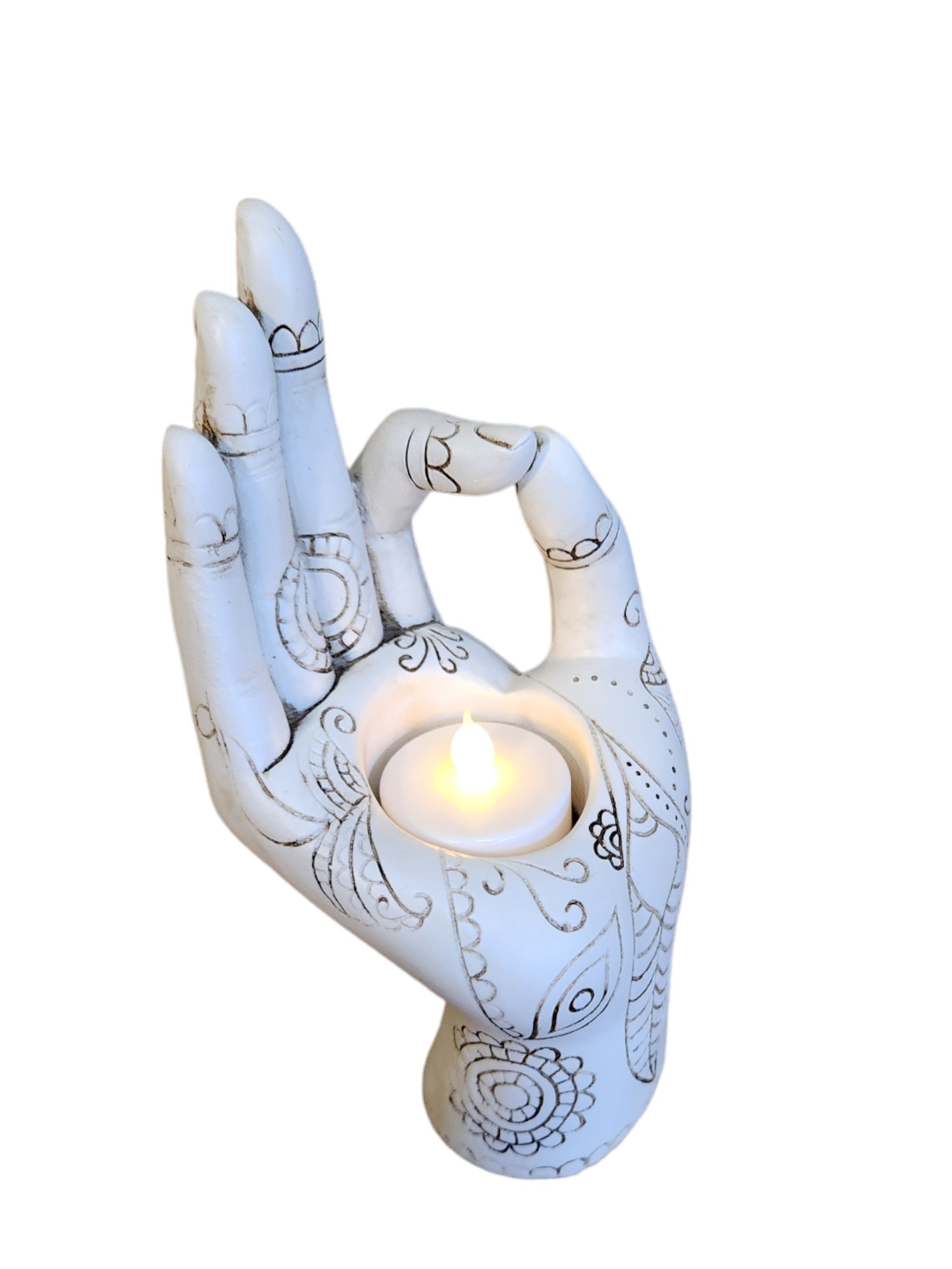 Mudra Hand Sculpture 7″ White Candle Holder Tea Light Buddha Hand